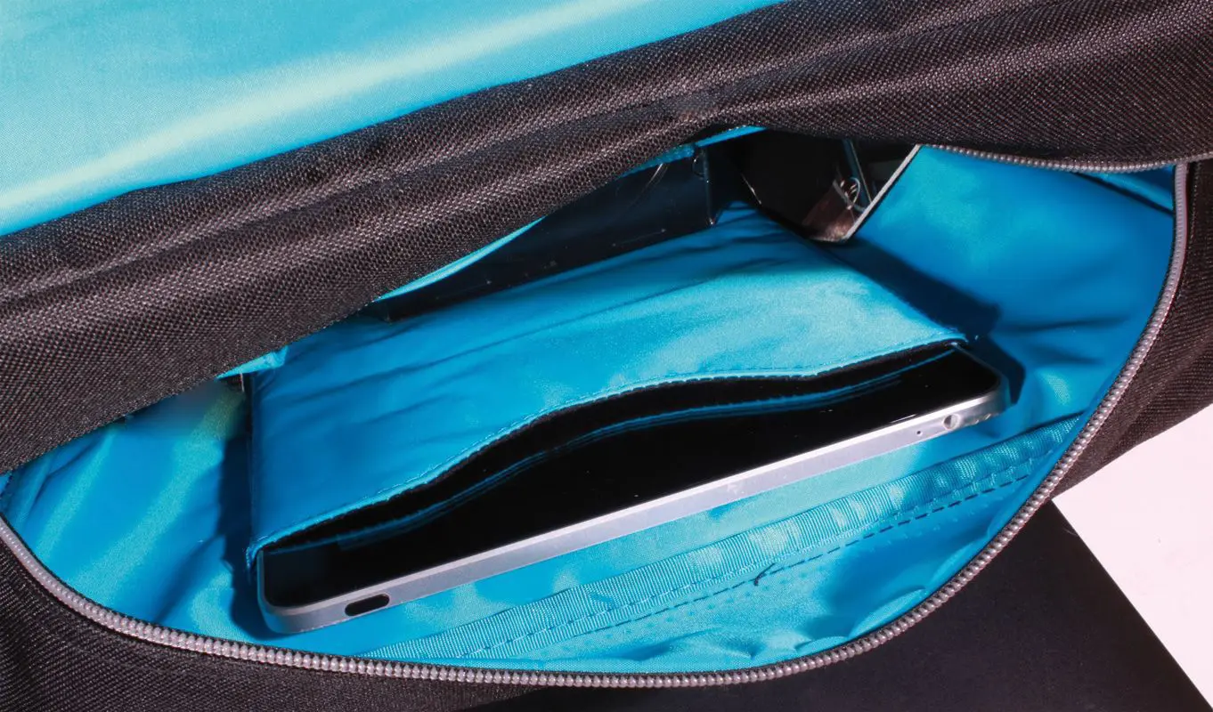 - Twee A4 vakken aan de achterkant (1 met rits en 1 met klittenband sluiting) voor schrijfblok, kabels, e.d.
