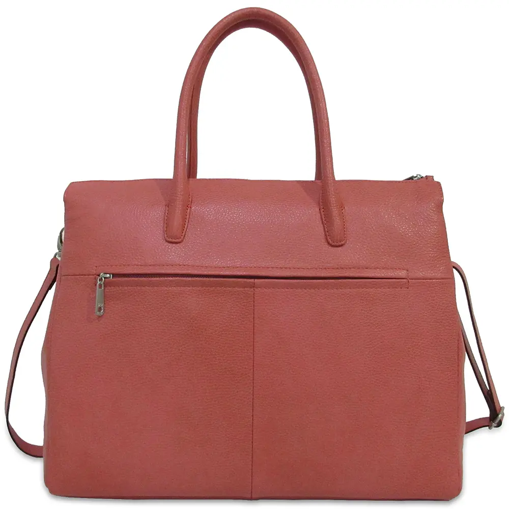 Deze dames werktas heeft aan de voor- en achterzijde een ritsvak voor de wat kleinere spullen. Met de twee leren handvaten kan de tas prettig in de hand gedragen worden. Of comfortabel over de schouder met de verstelbare en afneembare schouderriem. De metalen nopjes aan de onderkant zorgen voor extra bescherming.