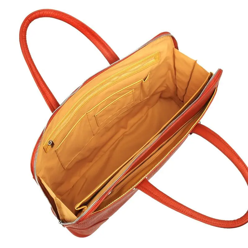 De Knomo Rubi 15 inch Terracotta is een fijne, modieuze werktas. Handgemaakt van hoogwaardige kwaliteit leer. Draag de tas comfortabel over je arm met behulp van de korte handvatten of op je schouder door middel van de afneembare schouderriem. Naast ruimte voor je laptop heeft de Rubi voldoende ruimte voor accessoires, schrijfblok, agenda en make-up spulletjes. Prachtige dames tas waar je graag mee voor de dag komt. En, niemand die ziet dat dit (ook) een laptoptas is.